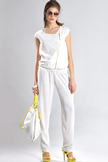 Стильный белый комбинезон из вискозы. Модель с длинными штанинами, без рукавов, на бедрах собран на резинку, имеет застежку - золотистую молнию, от плеча к бедру.