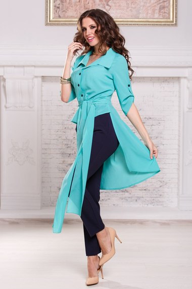 Яркая и стильная - бирюзовая рубашка с поясом и интересным кроем, станет любимой в вашей коллекции рубашек! Модель с рукавами до локтя, большим отложным воротником и глубоким V-образным вырезом.