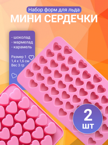 Подарите себе вдохновение с нашими очаровательными формами "Сердечки"!  В наборе две формы, каждая из которых позволит вам создать 55 миниатюрных сердечек размером 1,6/1,4 см и глубиной 1,3 см.  Представьте, сколько восхитительных угощений и милых сувениров помогут вам сделать эти силиконовые фигурные формы мини-сердца! Это формочки из пищевого силикона, а значит вы сможете изготавливать шоколад, мармелад, маршмелоу, леденцы, они идеально подходят для льда. Силиконовые формы для домашнего мармелада мармелада помогут Вам приготовить освежающий лед, оригинальные леденцы – все это станет реальностью. А как насчет ароматных мелтсов или саше для аромалампы или декора для свечей ручной работы?  Наши формы из высококачественного пищевого силикона безопасны, антипригарны, легко моются и выдерживают экстремальные температуры (от -40°C до +230°C). Просто промойте их теплой водой перед первым использованием – и вперед, к творческим свершениям!